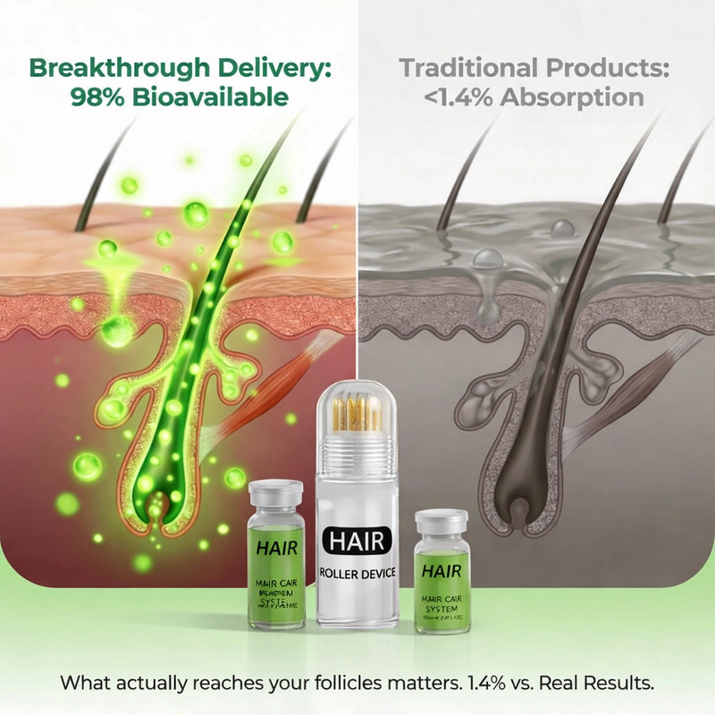 ✓ 18x Better Absorption — Creates micro-channels that bypass the scalp barrier, increasing penetration from 4.5% to 82% so ingredients actually reach starving follicles instead of evaporating on the surface