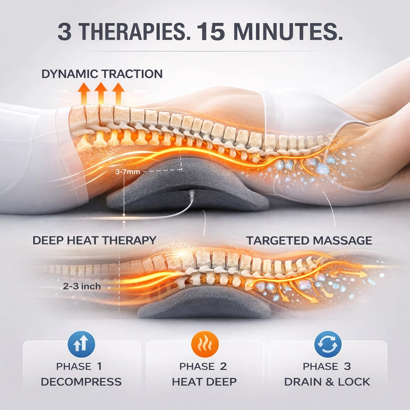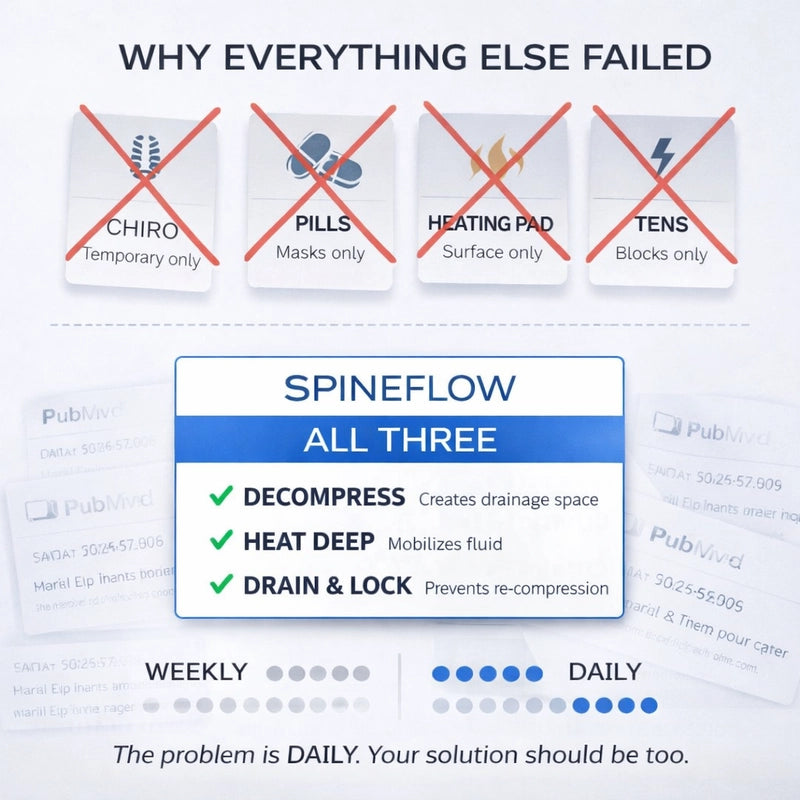 SpineFlow is specifically designed for people whose mornings are their worst time. If you rest all night but wake up in MORE pain, you're likely experiencing The 8-Hour Flood: inflammatory fluid pooling around your nerve while you sleep. SpineFlow's three-therapy approach addresses this by decompressing, heating deep, and draining, something no single-therapy device can do.