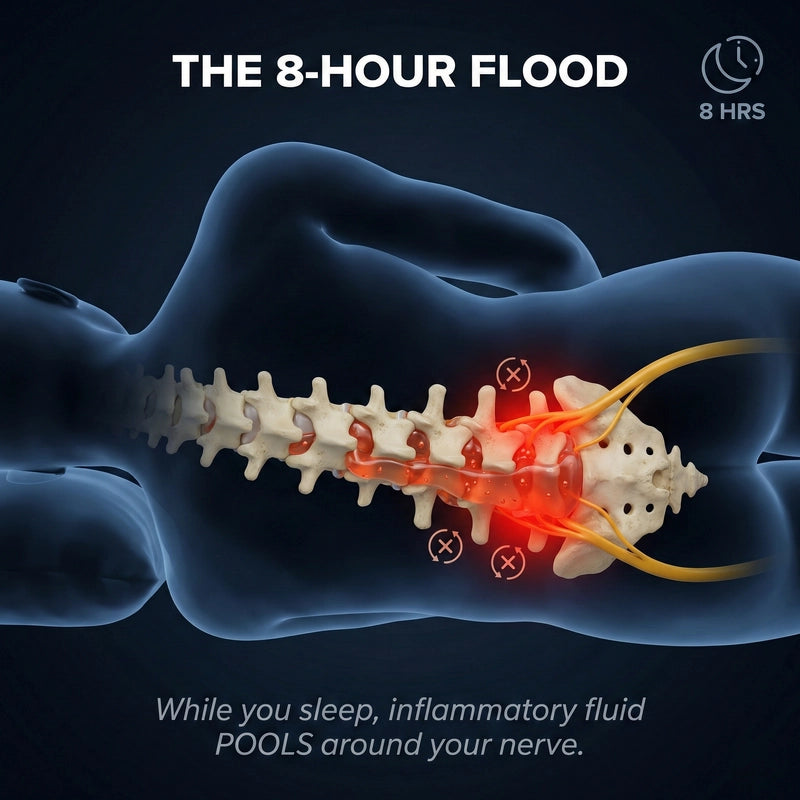 By morning, your nerve has been soaking in inflammatory chemicals for 8 hours straight. That's why your first steps feel like being stabbed.